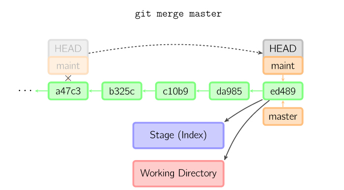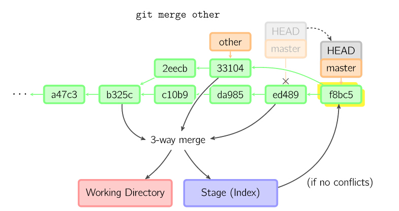 merge 命令把不同分支合并起来。合并前,索引必须和当前提交相同。如果另一个分支是当前提交的祖父节点,那么合并命令将什么也不做。 另一种情况是如果当前提交是另一个分支的祖父节点,就导致fast-forward合并。指向只是简单的移动,并生成一个新的提交