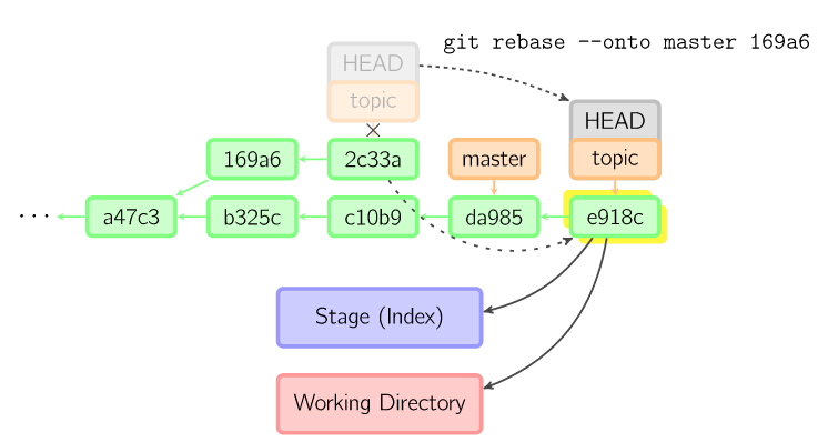 要限制回滚范围,使用--onto选项。下面的命令在master分支上重演当前分支从169a6以来的最近几个提交,即2c33a。
