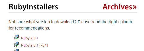 1)进入rubyinstaller官网下载相应的版本(http://rubyinstaller.org/downloads/)