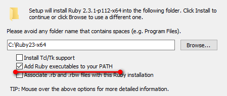 下载完毕,可以傻瓜式安装,但其中一个要说明的步骤是:勾选 Add Ruby executable to your PATH