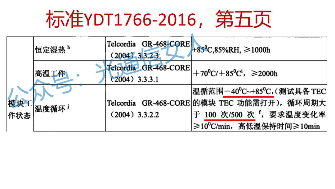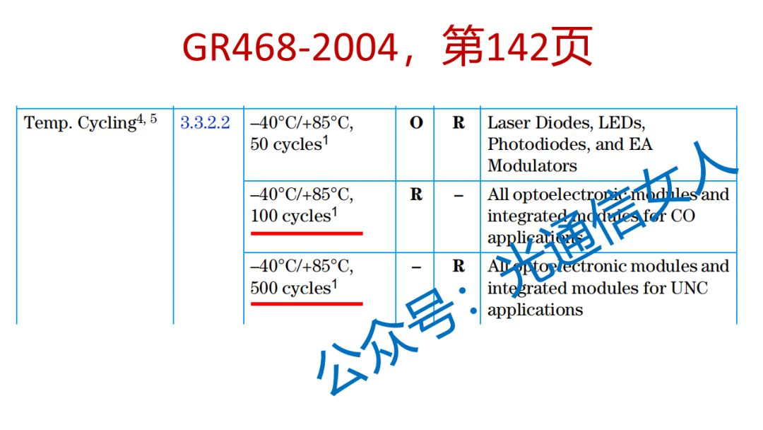 All optoelectronic modules and integrated modules for UNC applications,关键词是UNC,就是非中心机房应用的光模块,温度和次数–40°C/+85°C, 500 cycles,咱们5G前传的光模块,是在UNC环境中的,是非中心机房的应用,所以定义为500次