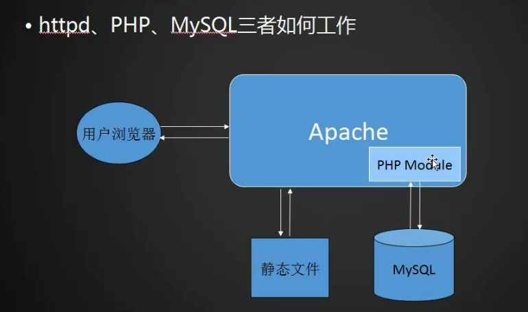 2、LAMP的工作原理:用户访问数据,httpd分别处理两种请求,动态请求和静态请求: