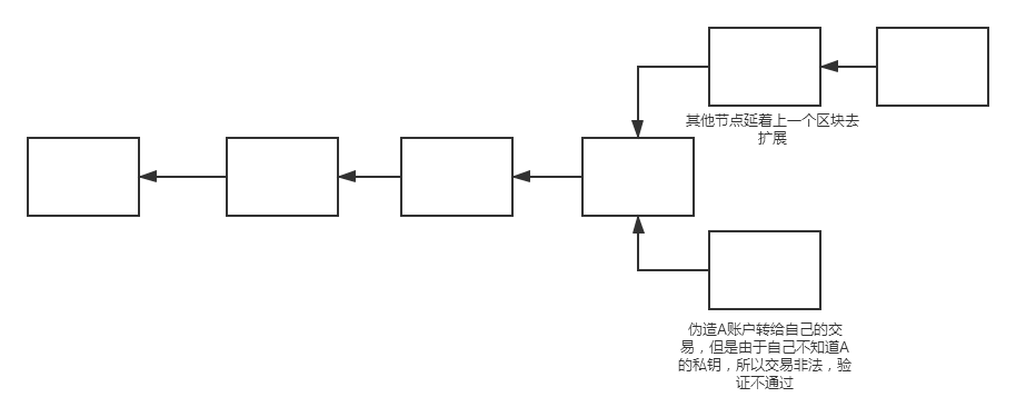 1.伪造一笔不合法交易,比如把别人账上的钱转到自己的账户上,但是由于自己不知道别人的私钥,所以不合法,验证不通过。那么其他诚实节点不会认同该区块,因为包含不合法交易,所以还会接着上一个区块去扩展,那么根据最长合法链,该区块不会获得block reward,而且浪费大量电力,人力。