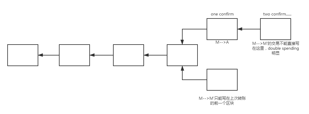 2.通过forking attack想把花出去的钱再次花出去,比如M转账给A,已经写到区块链中,那么现在M获得记账权,又发布另一个交易,把这个钱转回给自己。新的区块不能写在上次转账的区块后面,因为double spending很明显,只能写在上次转账的前一个区块后面,即forking attack。区块插入的位置是在设计区块的时候就决定的,这种情况下攻击难度很大,有恶意节点获得一次记账权是不够的,还需要不断地获得记账权。防范这种攻击就需要多等几个区块确认 confirmation,缺省情况下需要6个confirmation,这个时候认为前面的交易不可篡改,等待时间大概是一个小时左右。