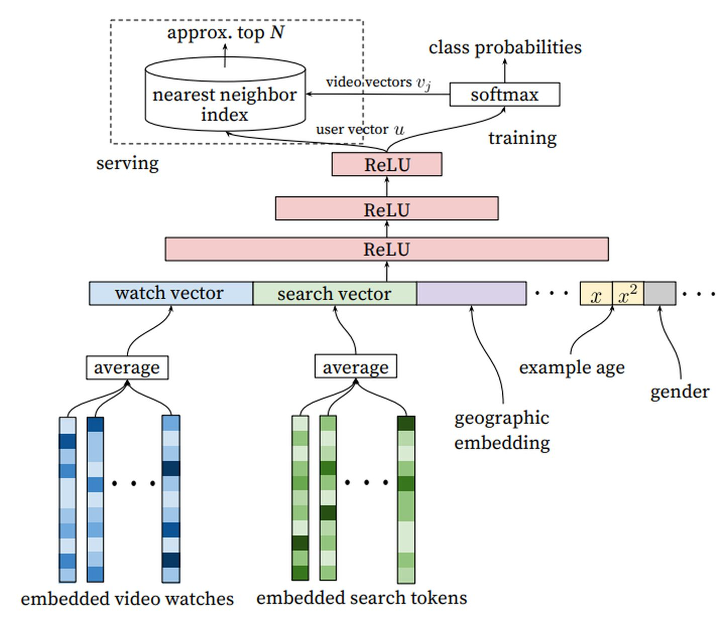 如上图 1 所示主要思想是把softmax的前一层的输出作为user的embedding,而softmax层中的权重矩阵的每一行向量作为video的embedding,这样在模型的部署过程中,就没有必要部署整个神经网络来完成从原始特征向量到最终输出的预测过程,只需要将User Embedding和video Embedding存储到线上内存数据库,通过内积运算再排序的方法就可以得到video的排名,这大大加快了召回效率。