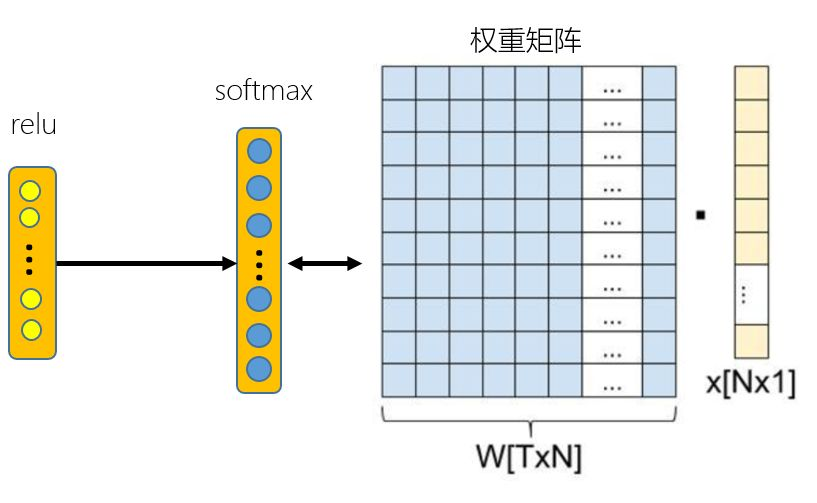 这个全连接层(图中softmax)的每一个神经元都对应有上一层全连接层(图中relu)输出的权重向量,为上图中W[T×N]权重矩阵的每一行,而这每一行权重向量就是video embedding,个数和神经元的个数相同都是视频库中视频的个数T,上一层全连接层(图中relu)的输出为user embedding,是上图中的X[N×1]。因此通过内积user embedding和video embedding其实得到的正是未经过softmax函数归一化的每个视频的预测值,从一定程度上反映了预测概率的大小。