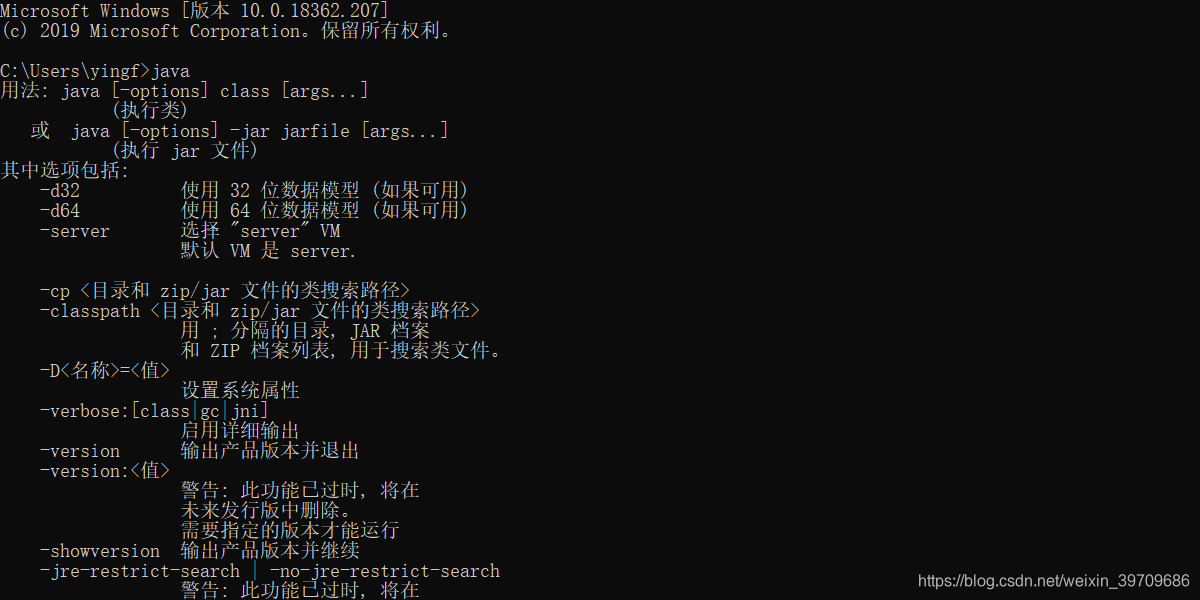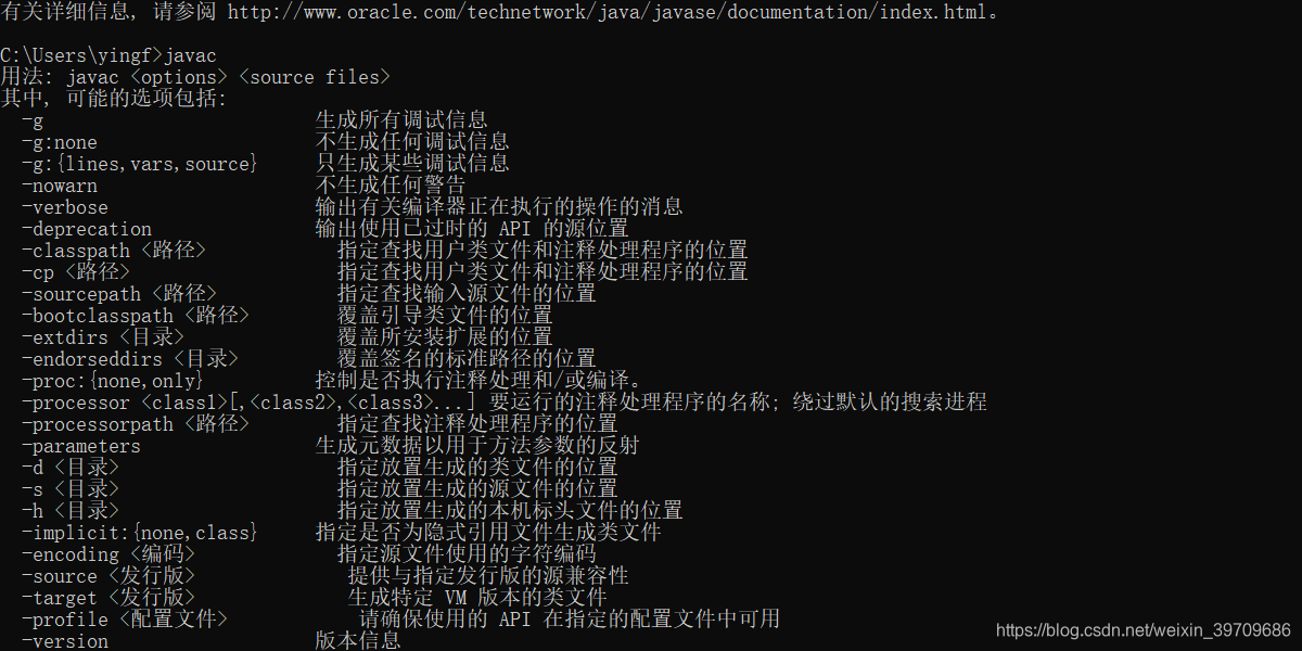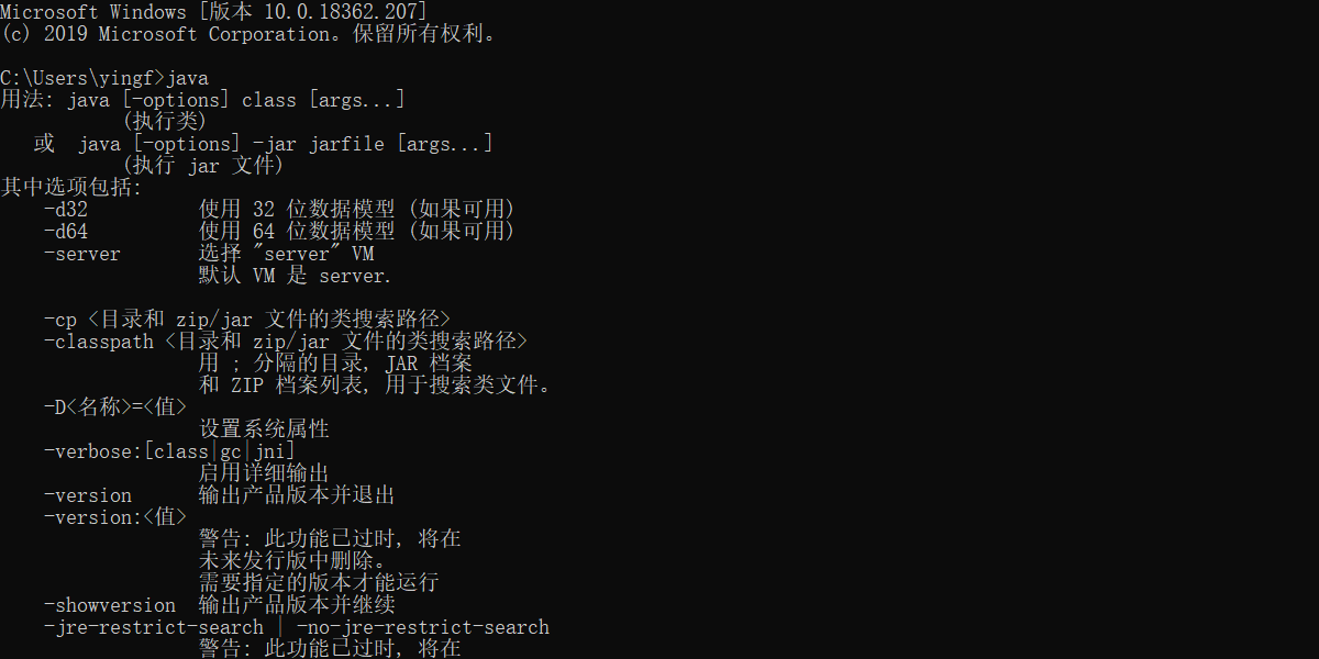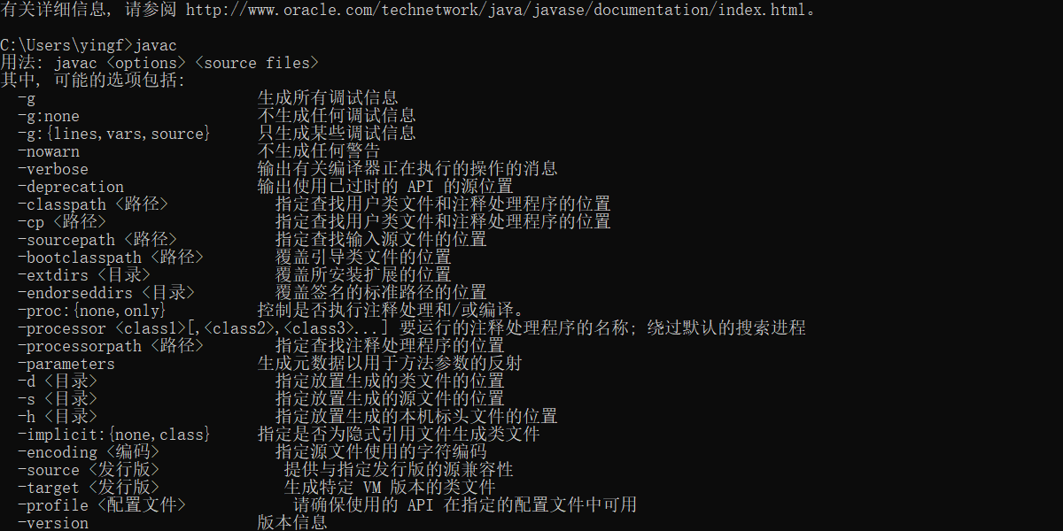 在控制台分别输入java、javac、java -version命令,出现如下所示即为配置成功java命令: