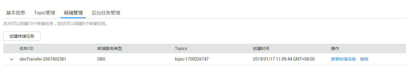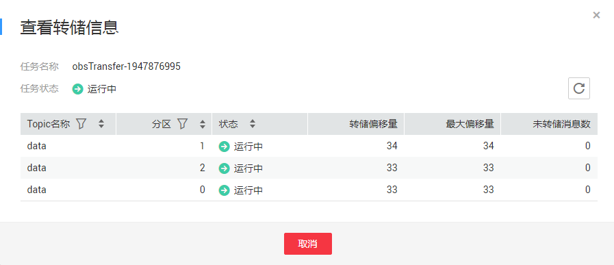 创建转储任务后,可以在转储管理页中看到这个任务信息,点击查看转储信息,可以实时查看转储Topic的消息转储进度。