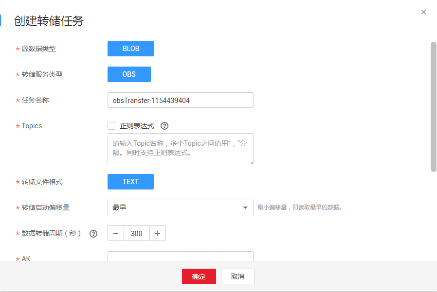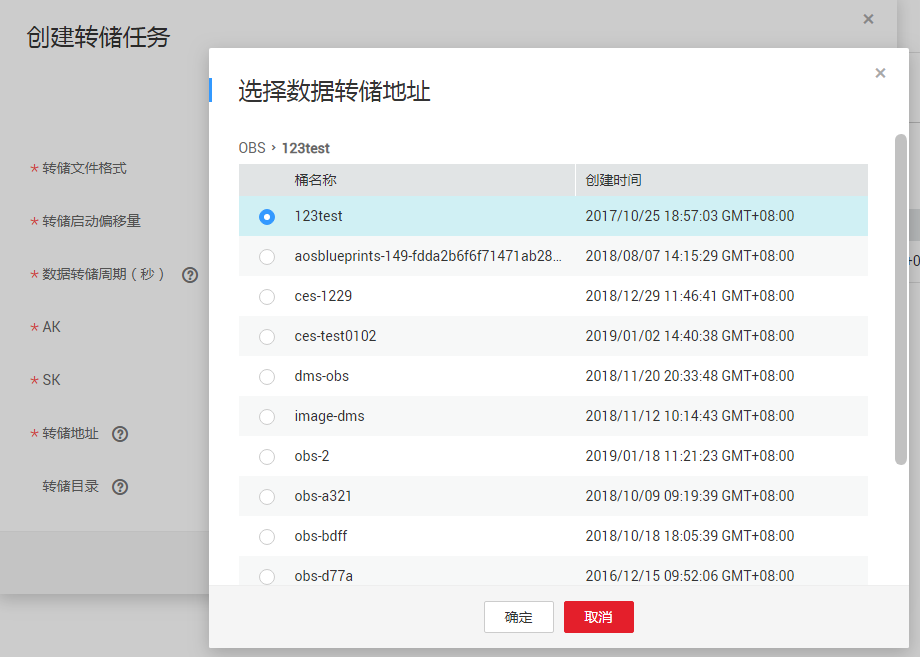 需要填入打星号的必填参数。这里主要关注要填入的参数Topics,即需要转储的Topic名称,支持多个Topic的输入或者正则表示的方式去订阅Topic消息,并把消息内容上传到OBS桶中。点击转储地址行中的选择按钮,弹出选择数据转储地址,会列出那些OBS桶可以被转储。