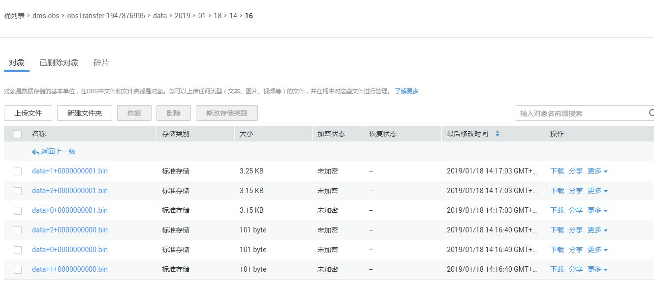 登录华为云OBS可以查看到转储地址桶的中存在分区的文件,已经按照转储时设定的时间格式上传到dms-obs桶中。