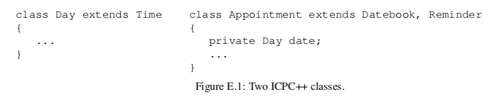 Two familiar concepts in object oriented programming are the is-a and has-a relationships. Given two classes A and B, we say that A is-a B if A is a subclass of B; we say A has-a B if one of the fields of A is of type B. For example, we could imagine an object-oriented language (call it ICPC++) with code like that in Figure E.1E.1E.1, where the class DayDayDay is-a TimeTimeTime, the class AppointmentAppointmentAppointment is both a DateBookDateBookDateBook and a ReminderReminderReminder, and class AppointmentAppointmentAppointment has-a DayDayDay.