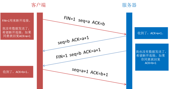 - 第四次挥手:客户端发送消息给服务器,确定分手,服务器关闭连接。