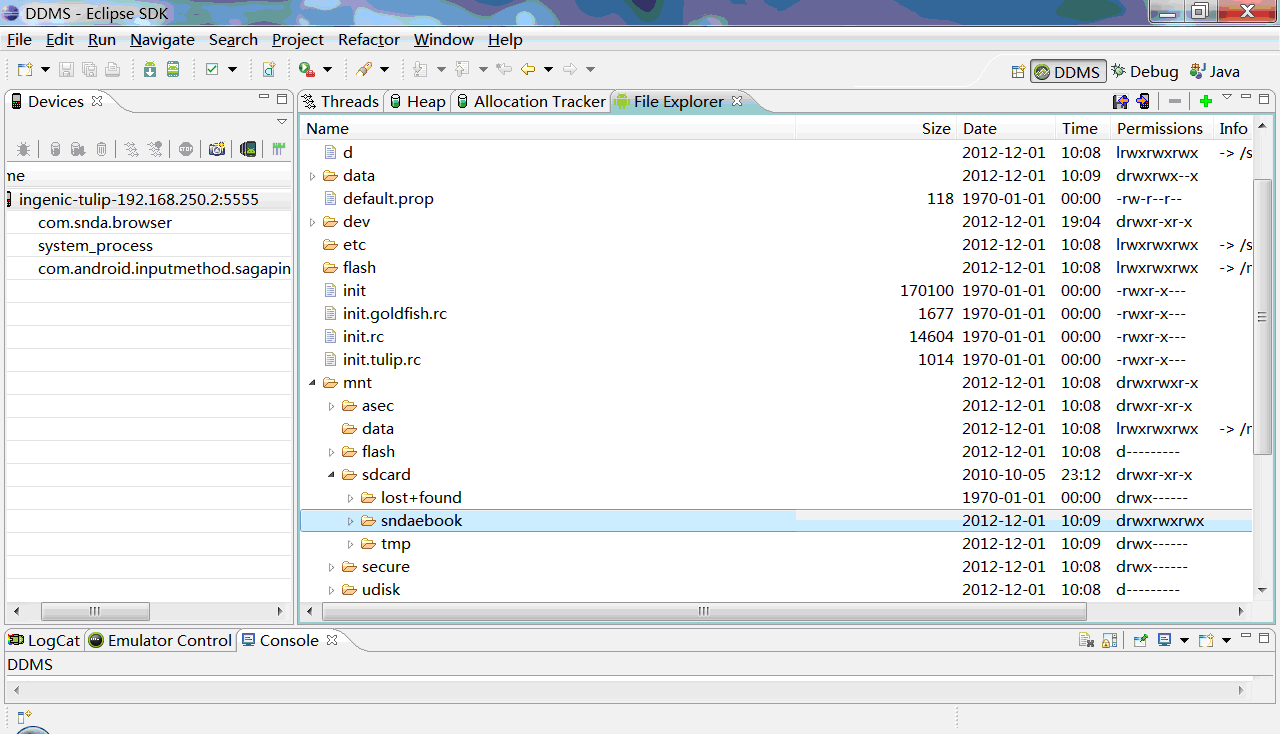 在Eclipse的DDMS中浏览目录,主要关注/system/app/目录和/mnt/sdcard/sndaebook目录,如图二。