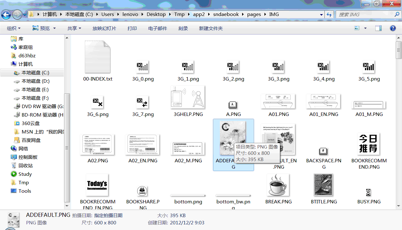 在下载的目录搜索PNG,然后按大小排序,很快发现sndaebook\pages\IMG\ADDEFAULT.PNG为BamBook默认显示的待机图片,如图三。同时在\sndaebook\pages目录下可以看到很多HTML文件,从中查找出ADDEFAULT字符串,如图四。