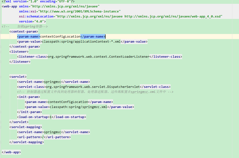 - 最后在web.xml文件中加载spring的配置文件和配置springmvc的前端控制器