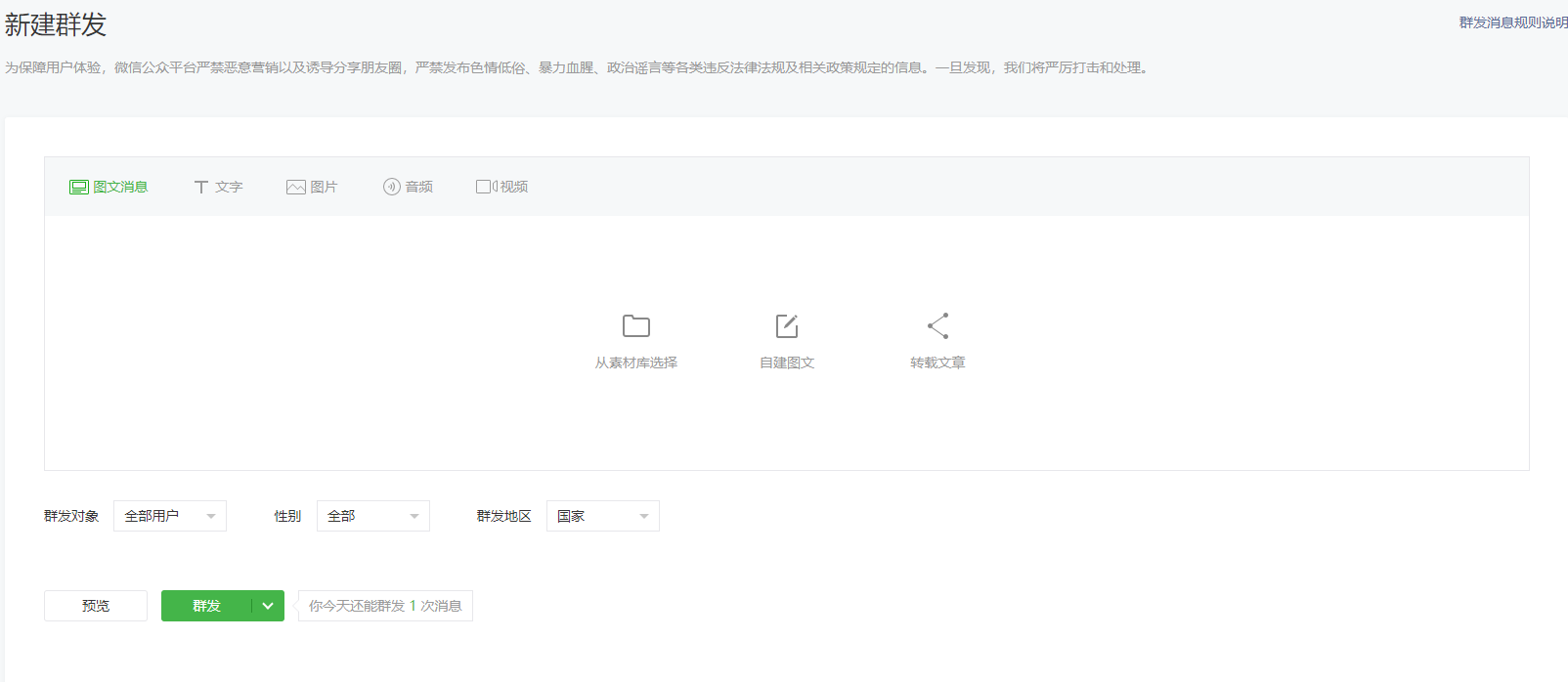 此时就可以通过消息群发进行发布消息,每天限发一条。