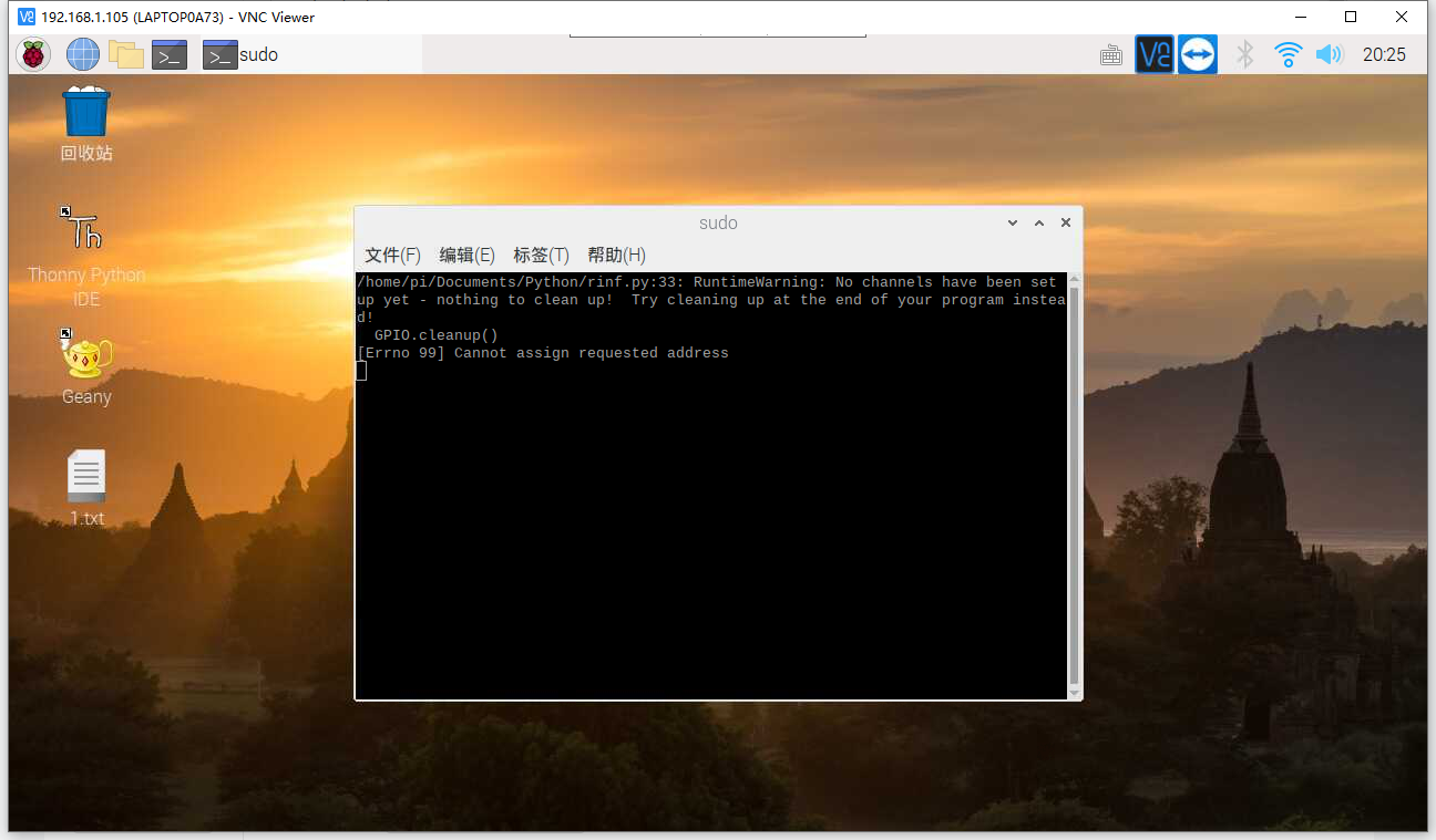 6、重启,连上VNC,可以看到命令行界面已经打开,程序也在里面执行,print的信息也能正常显示了。