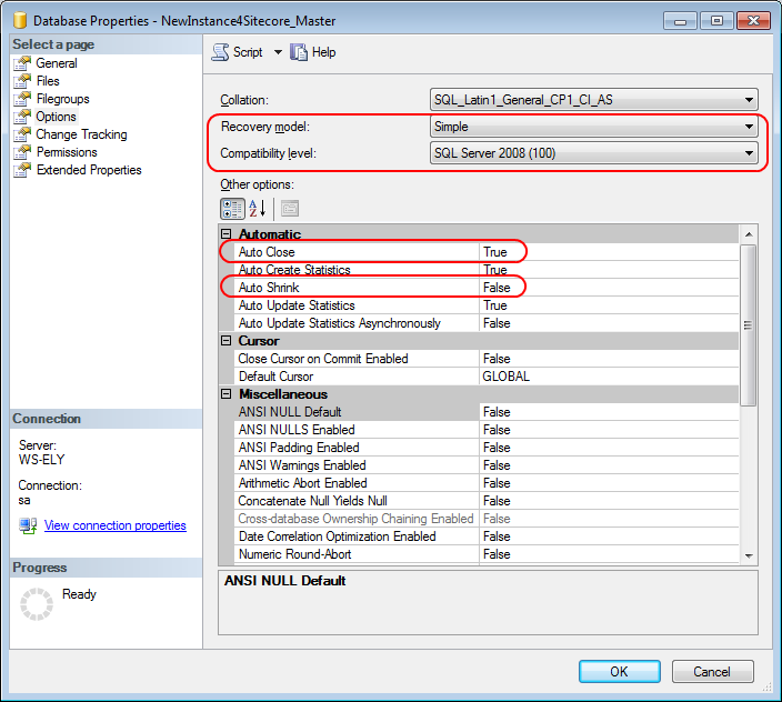 - 在Compatibility Level 字段,选择SQL Server 2008(100)