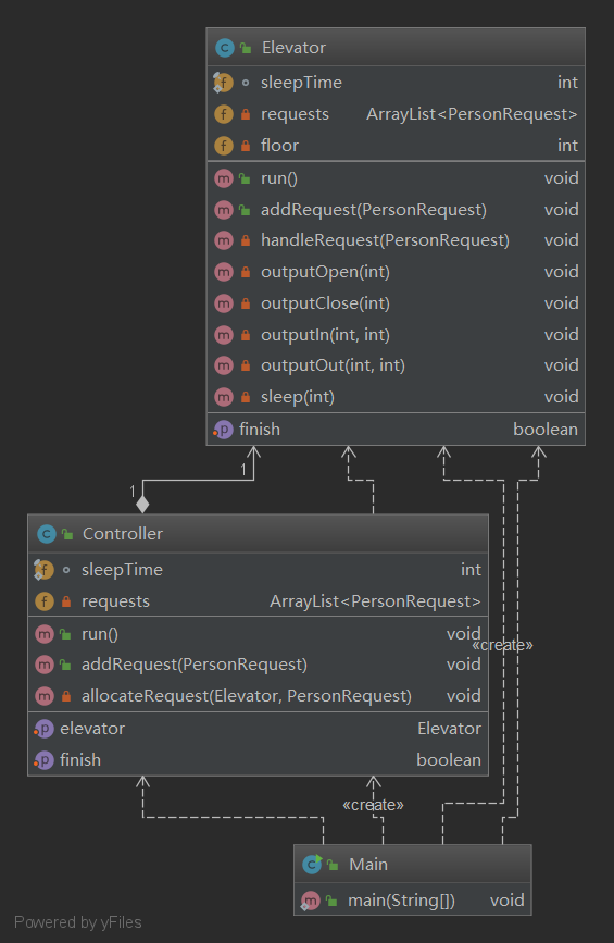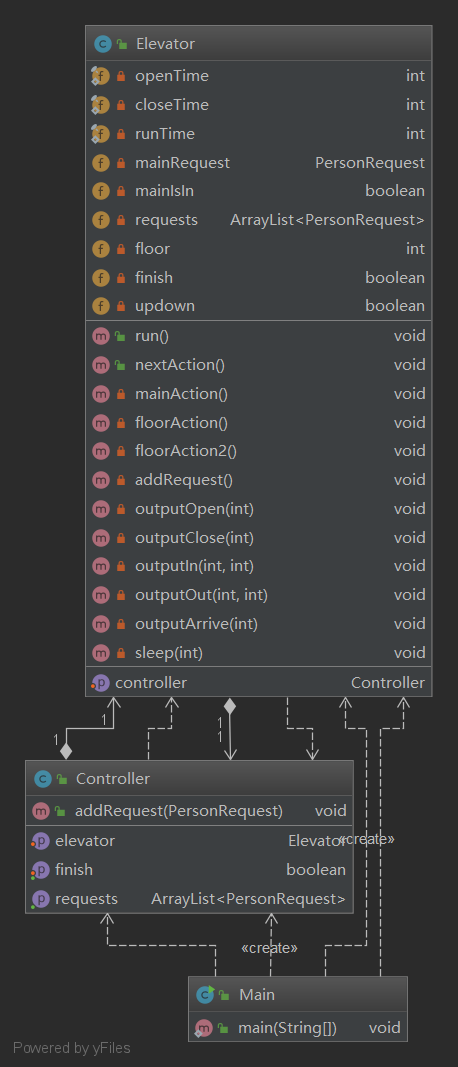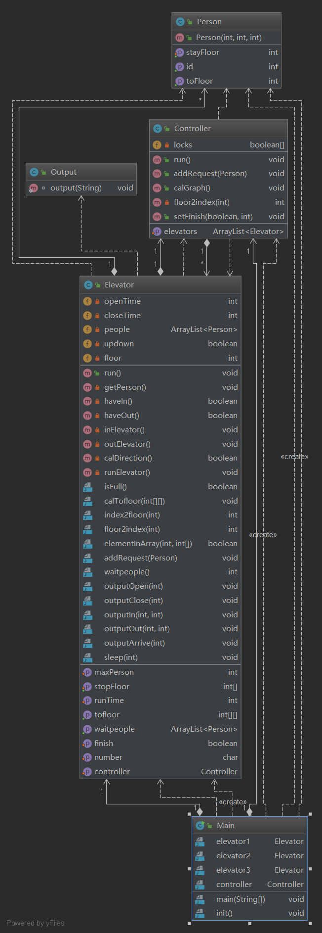 1、类图:主要设计了三个类,电梯类,控制器类,Main函数,其中有三个线程,输入线程,控制器线程,电梯线程,输入线程将乘客数据传入控制器,再由控制器分发给电梯,电梯负责乘客的具体配送