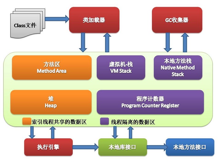 - 本地方法栈:与JAVA栈类似,区别是使用的对象不一样,本地方法栈是给Native方法使用的,JAVA栈是给JAVA方式使用的;