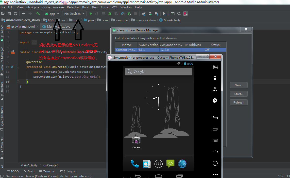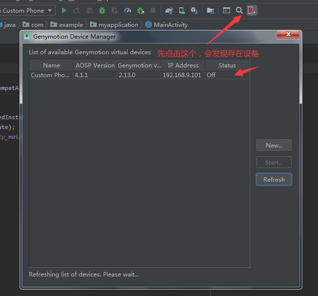 运行APP之前,要在Genymotion中先把目标虚拟设备运行起来,不然Android Studio的IDE不能发现这个设备。其实就好比真机调试,真机没开机,IDE当然发现不了,说白了就是要先用Genymotion打开安卓模拟器,之后再打开Android Studio会发现: