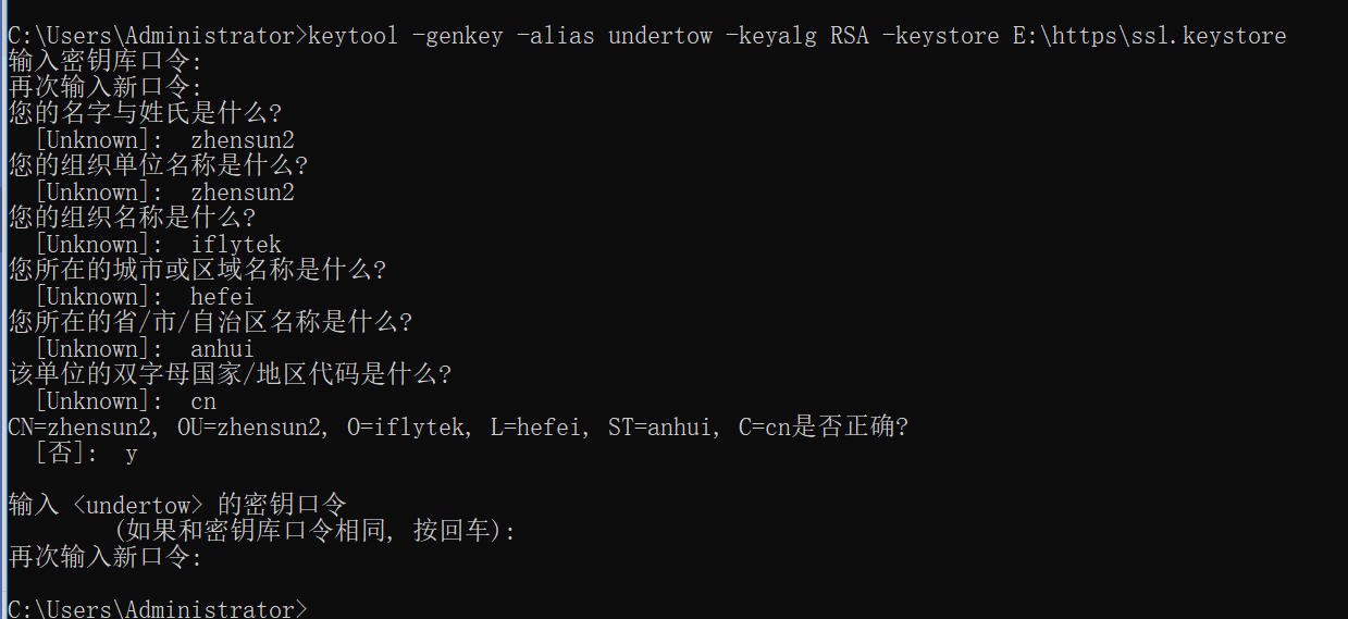 C:\Users\Administrator>keytool -genkey -alias undertow -keyalg RSA -keystore E:\https\ssl.keystore