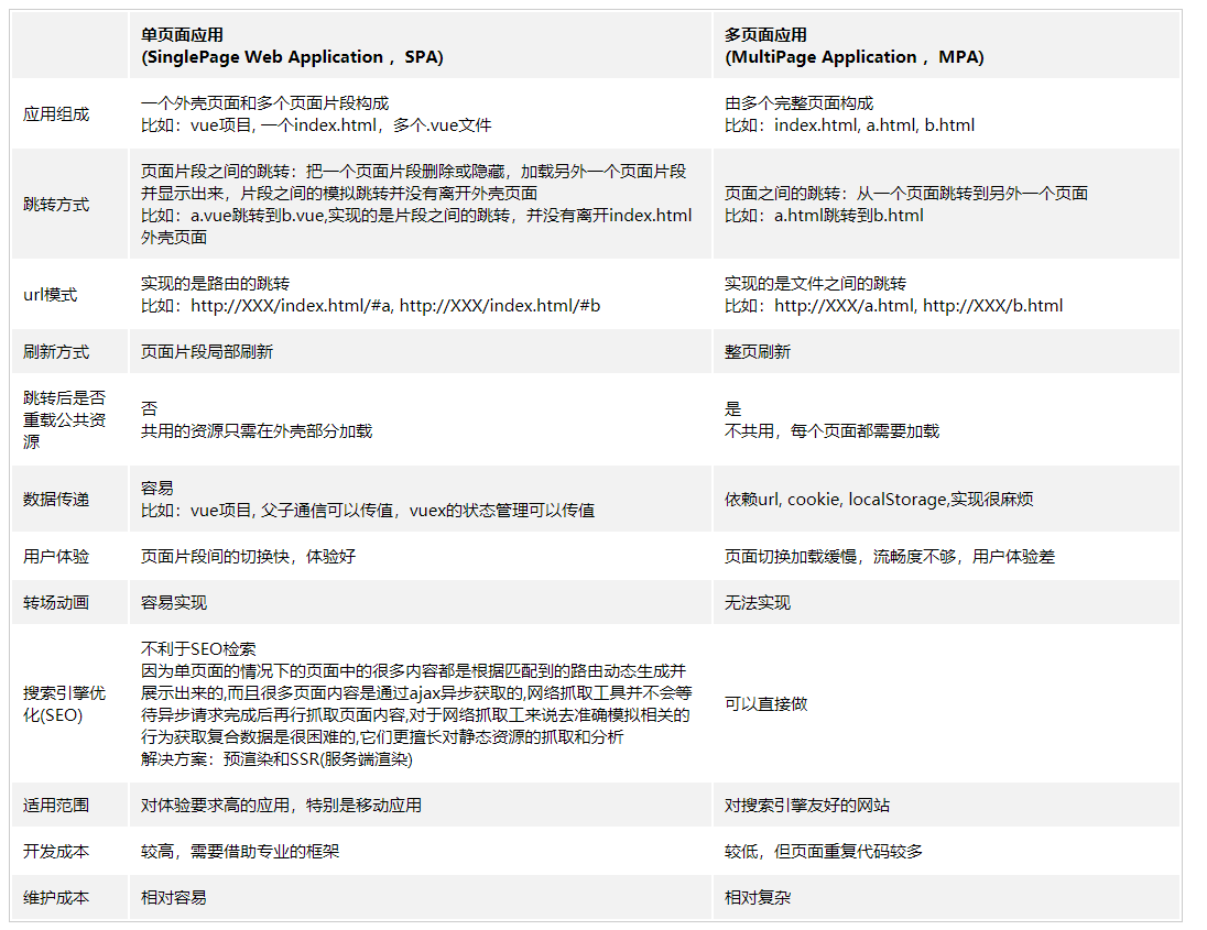 单页面应用( SinglePage Web Application ,SPA):通俗讲就是只有一个主页面的应用,浏览器一开始要加载所有必需的js,css,单页面跳转仅刷新局部资源,共用资源(js,css)仅需加载一次, 常用于PC端官网、购物等网站