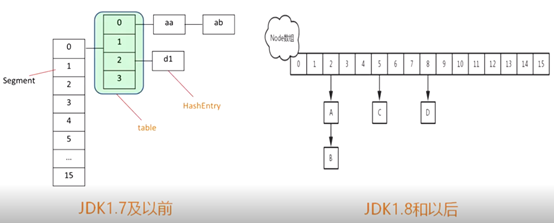 ConcurrentHashMap采用分段锁技术,跟Hashtable相比,它不是锁全部数据,而是锁一部分数据。ConcurrentHashMap默认并发是16。