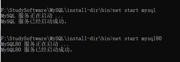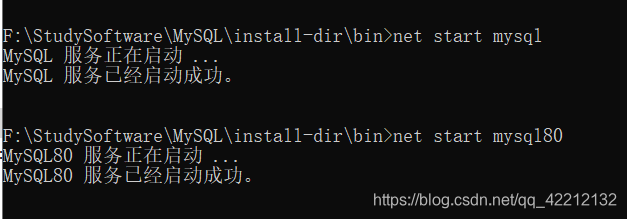 去百度之后发现我的安装目录下,也就是和bin目录同级的目录下没有data文件夹,于是打开cmd窗口,进入安装所在文件夹下的bin目录,输入mysqld --initialize,出现了data目录,结果并没有net start mysql成功,我在服务窗口手动启动时发现两个,一个是MYSQL,一个是MYSQL80,