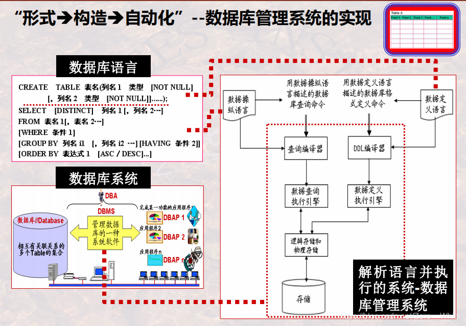 - DBMS依照用户的定义,创建数据库及其中的Table