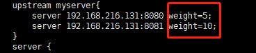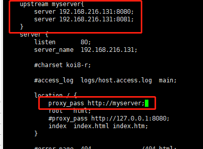 配置nginx负载均衡配置 找到nginx目录下conf中的nginx.conf 配置两块地方,其中upstream 后面的myserver是自己起的一个名字,涌入下面代理的,具体如下图: