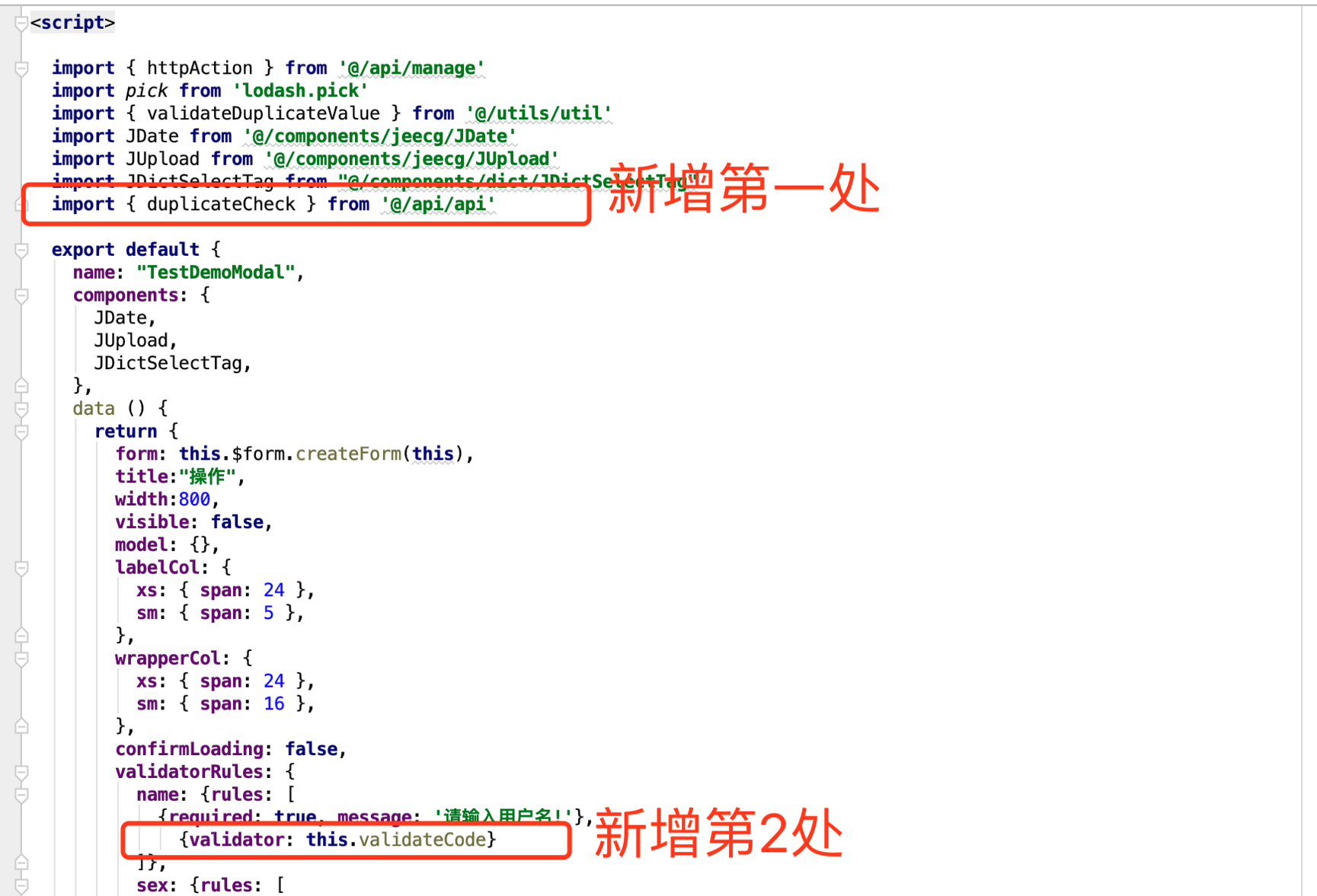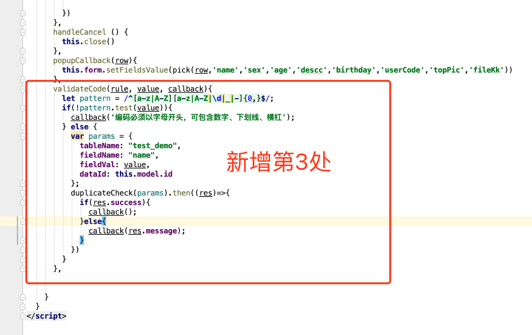 第二处:找到编码必填校验规则的前端代码,新增如下:
