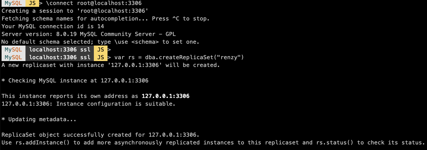 MySQL localhost:3306 ssl JS > var rs = dba.createReplicaSet("renzy")