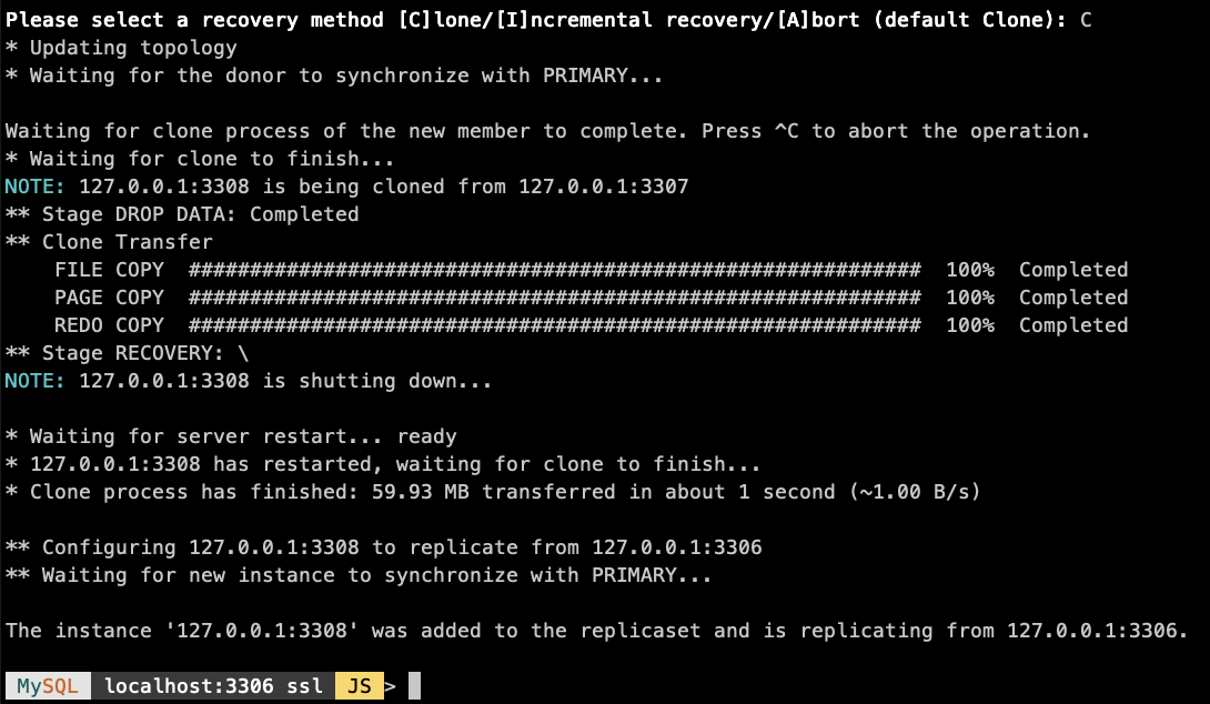MySQL localhost:3306 ssl JS > rs.addInstance('localhost:3308')