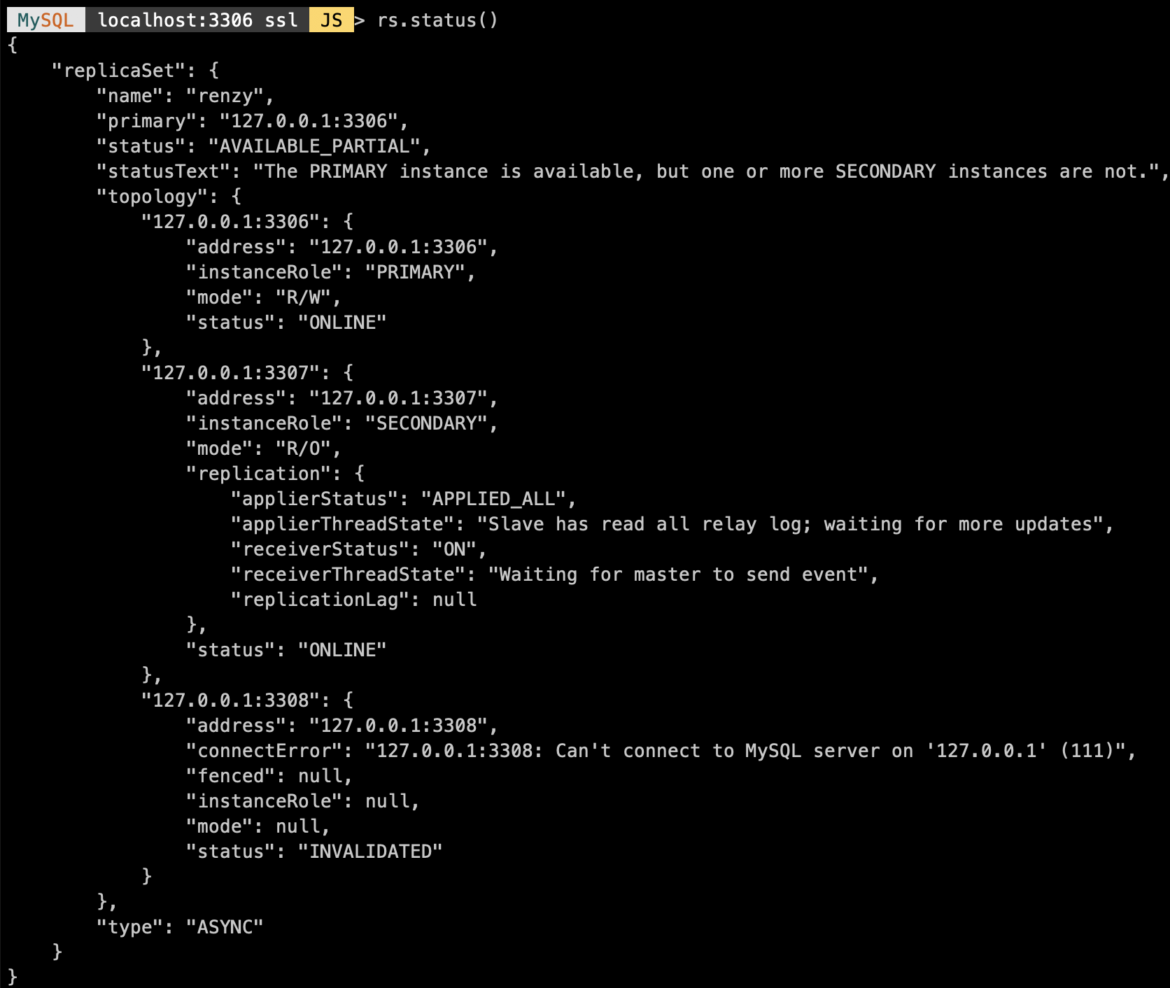 MySQL localhost:3306 ssl JS > rs.status()