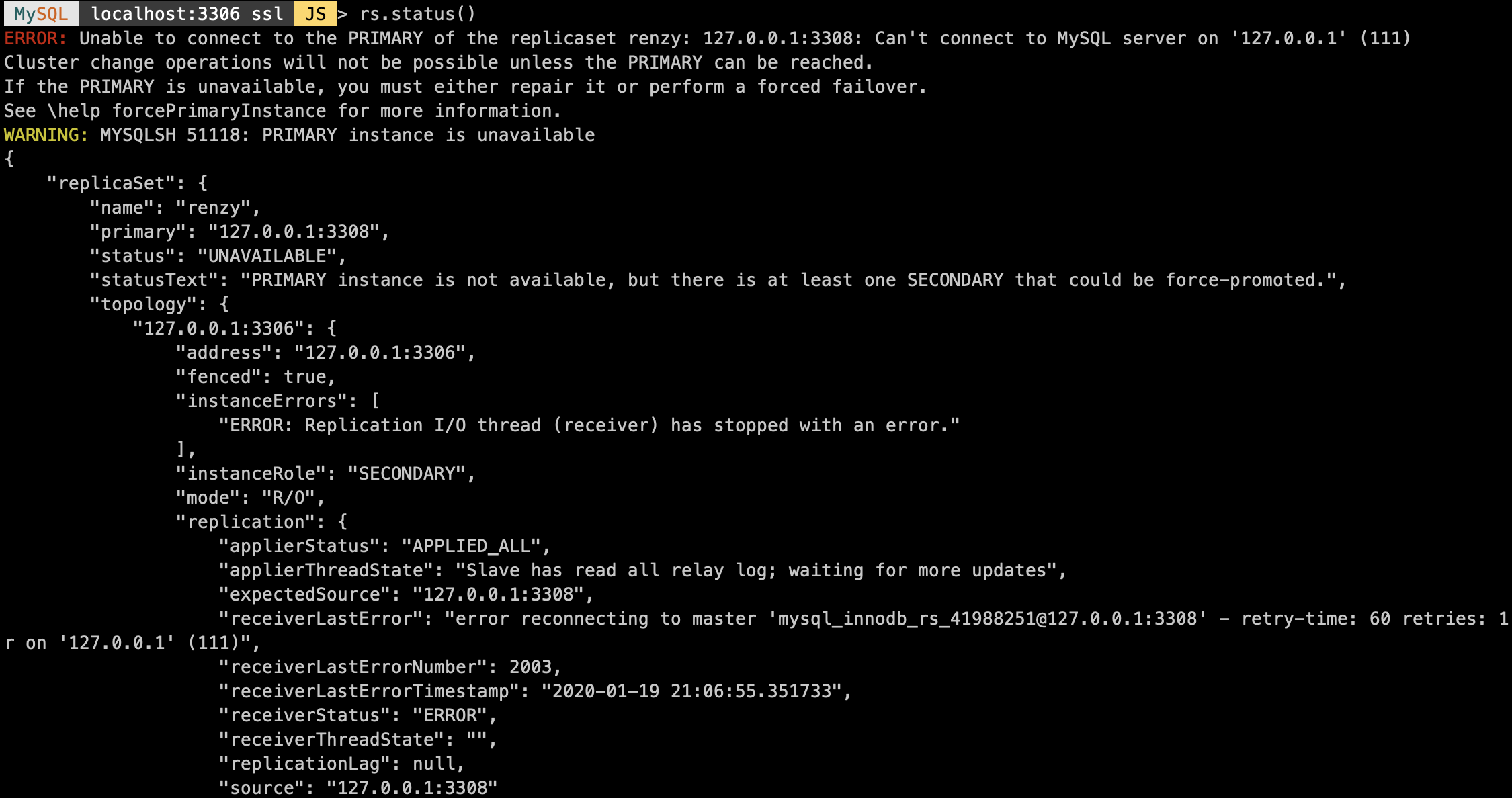 MySQL localhost:3306 ssl JS > rs.forcePrimaryInstance("127.0.0.1:3306")