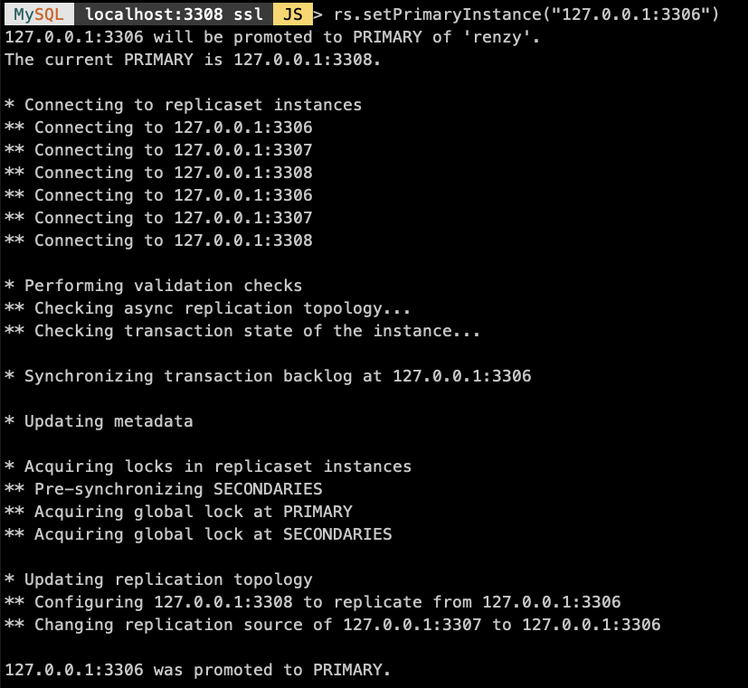 MySQL localhost:3306 ssl JS > rs.setPrimaryInstance('127.0.0.1:3308')
