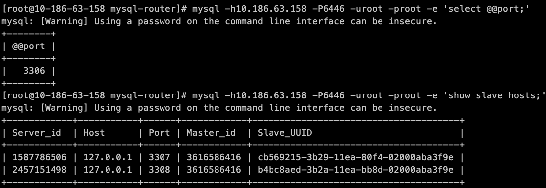 # mysql -h10.186.63.158 -P6446 -uroot -proot -e 'select @@port;'