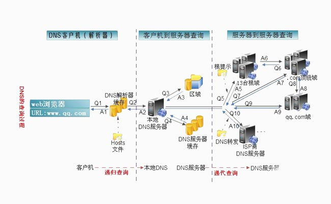 客户机向本地DNS服务器发送请求,等待肯定或者否定回复的过程为递归过程 迭代是本地服务器向根DNS服务器发出请求,而根DNS服务器只是给出下一级DNS服务器的地址,然后本地DNS服务器再向下一级DNS发送查询请求直至得到最终答案。 DNS解析过程:host文件-本地DNS-根域名服务器-顶级域名服务器-二级域名服务器-...... 来源:CSDN作者:wj2555111链接:https://blog.csdn.net/wj2555111/article/details/104617060 标签 dns 递归 域名解析