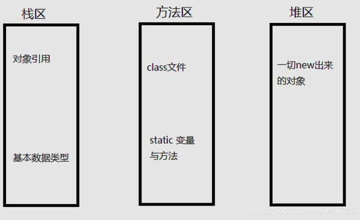 方法区: 1.又叫静态区,跟堆一样,被所有的线程共享。方法区包含所有的class和static变量。 2.方法区中包含的都是在整个程序中永远唯一的元素,如class,static变量。
