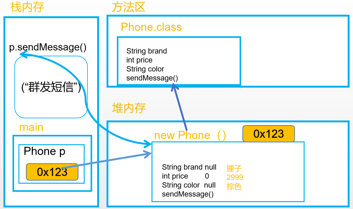 ·在栈中运行main方法,当jvm看到Phone时,会自动把Phone类加载到方法区;当看到局部变量p时,会在栈中开辟一块空间;当看到new Phone()时,会在堆内存中开辟空间,并将堆内存中的对应地址0x123赋值给p;还会拿到方法区的地址值指向方法区。