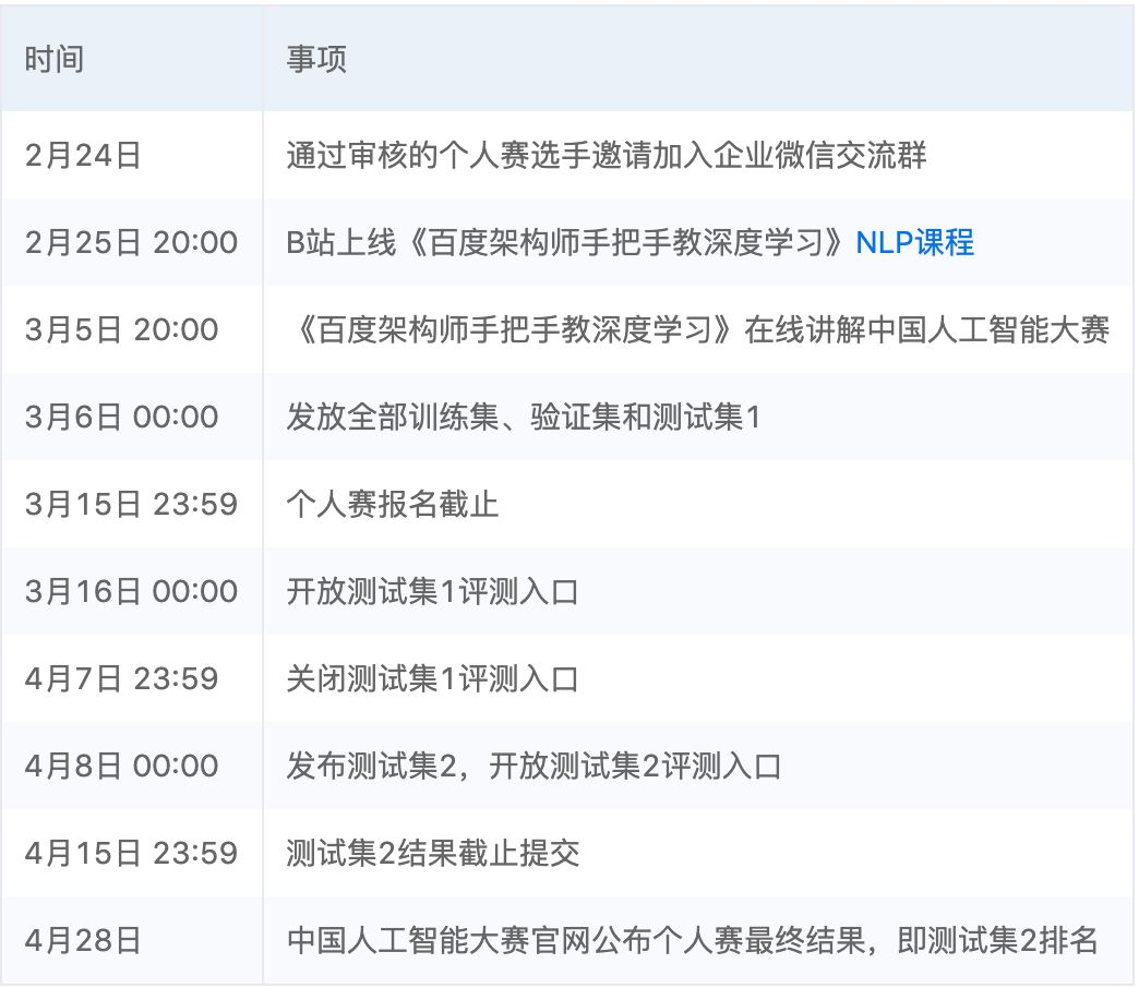 为帮助新手快速入门NLP,百度飞桨零基础集训营NLP班已于2月25日正式开课。3月5日特设课程将邀请百度工程师在线讲解本次大赛的官方基线系统和参赛技巧。