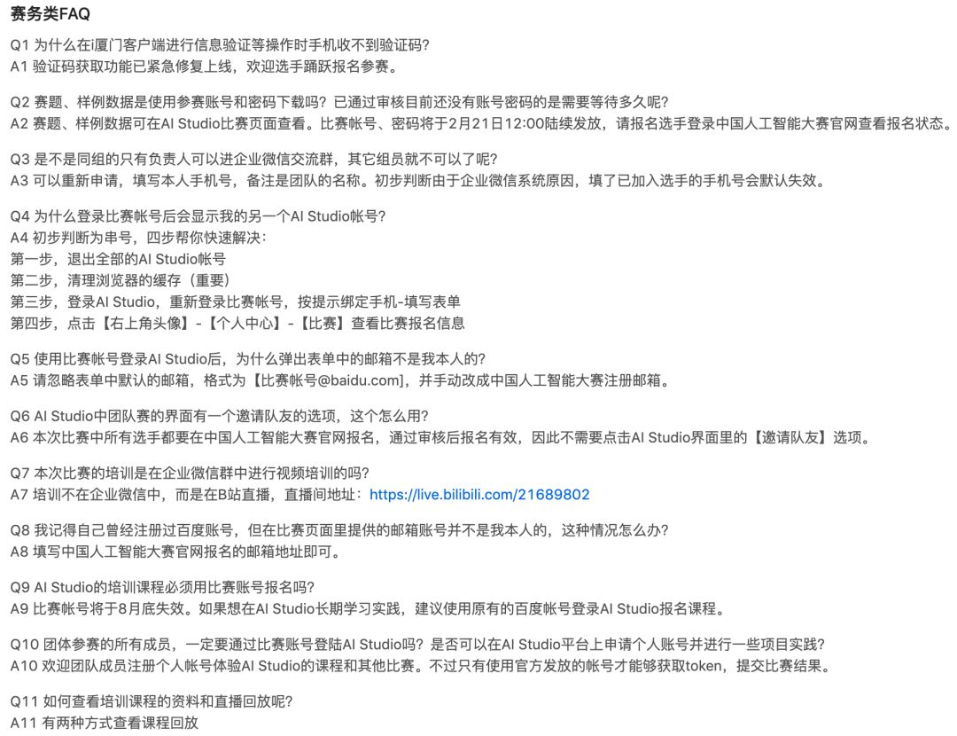 报名并通过审核的参赛选手将被邀请加入中国人工智能大赛企业微信交流群,群里有2名小伙伴轮流在线值班答疑,第一时间解决大家参赛过程中遇到的问题,每日不定期分享NLP知识点,也可前往AI Studio比赛详情页的【相关资料】中查看每日FAQ。