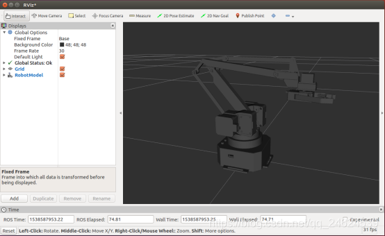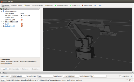 启动成功后,可以看到上图所示的机器人模型,此时可以用手拖拽物理机械臂,可以看到机器人模型会同步运动。