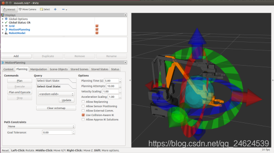 启动成功后,可以看到上图所示的MoveIt!控制界面,使用控制球选择一个机械臂的运动目标,点击“plan”、“execute”后,可以看MoveIt!会自动产生运动轨迹,物理机械臂和仿真模型同步运动。