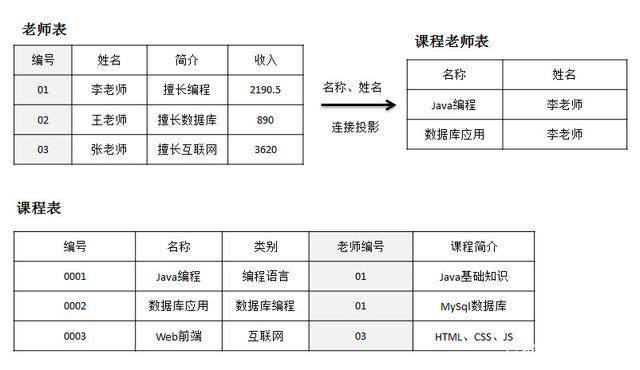 连接运算属于二目运算,是从两个关系元组的所有组合中选取满足一定条件的元组,由这些元组形成连接运算的结果关系,其中条件表达式涉及到两个关系中属性的比较,该表达式的取值为真或假。图2-16所示为对课程表和老师表在老师编号相等的条件下进行了连接,在新的关系中仅选出名称、姓名两个属性,即在新关系中再进行一次投影运算,这样得到了所有老师编号为01的课程名称和老师姓名。