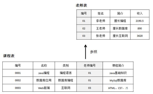 (3)参照完整性。实体完整性是一个表内的约束,参照完整性是在不同表之间或同一表的不同元组之间的约束。例如课程表中的老师编号属性给出了老师的编号,但在课程表中并没有老师的信息,要想得到老师的信息,就必须通过表中的老师编号到老师表中去查找。由于编号在老师表中是主键,这样能够找到唯一的一行与该老师编号相对应。对于老师表中的编号属性来说,通常定义是该表的外关键字,简称外键,同时,编号属性也是老师表的主键。如图2-17所示: