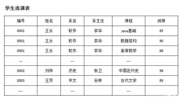 在学生选课表中除了姓名和系名依赖编号外,还存在其它数据依赖,如一个系只有一个系主任,因此系名依赖于系主任;再如,每个学生学习一门课都有一个成绩,因此成绩依赖于学号和课程名称。因为学生选课表中数据依赖过多,导致发生更新异常和数据冗余问题。
