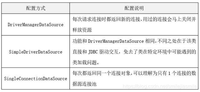 Spring提供的JDBC驱动提供了三类数据源的配置方式,开发者可以根据程序需要选择不同的配置方式,配置方式及其配置说明如下表所示。