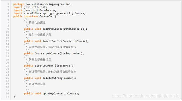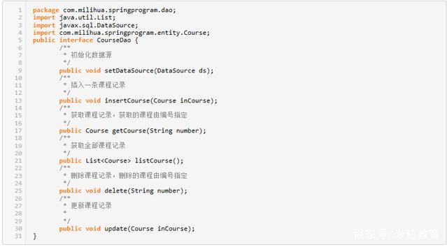 访问数据库的操作一般是增、删、改、查。增是在指定的数据库表中插入一条记录;删是在指定的数据库表中删除一条记录;改是在指定的数据库表中修改记录;查是按指定条件查询数据库表记录。数据访问对象接口就是定义操作数据库表的增删改查接口。下面给出课程案例mooc数据库course表的DAO接口。